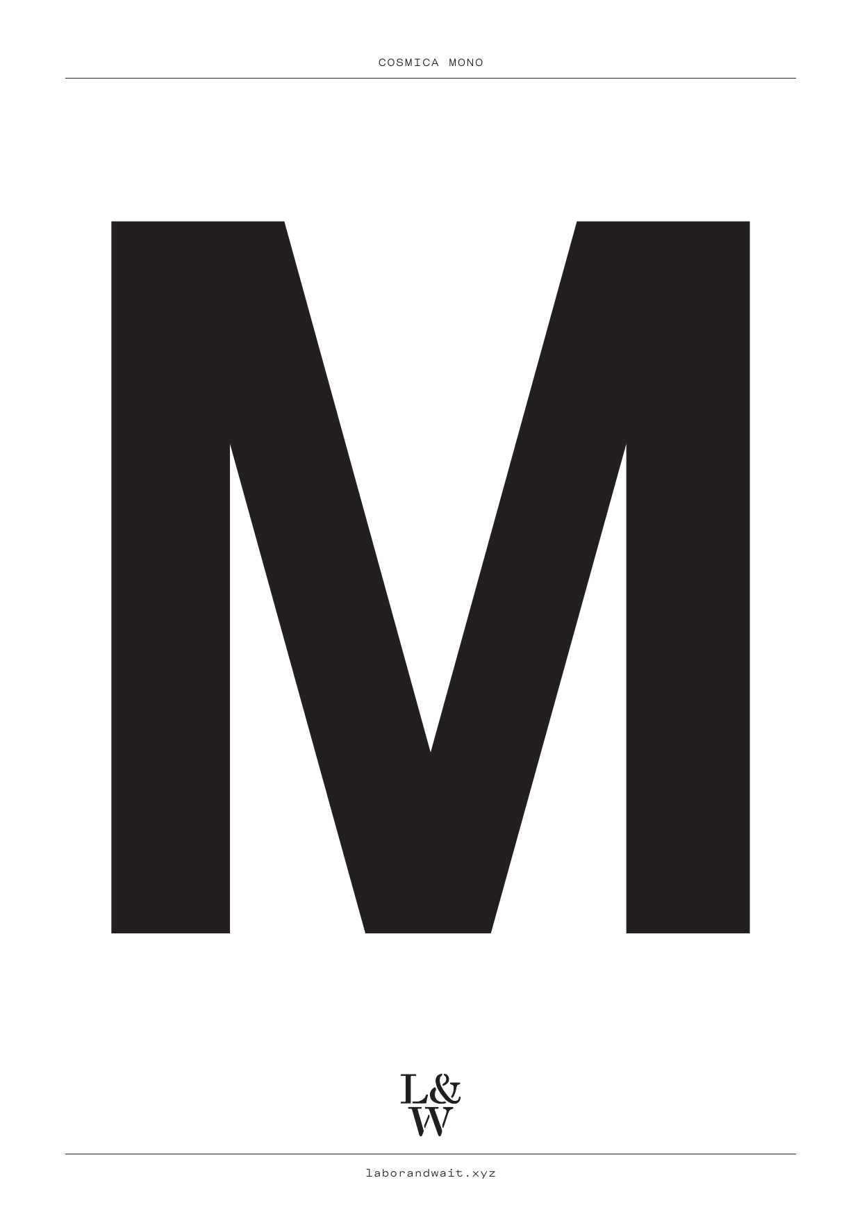 Cosmica Mono is the first retail monotype release from L&W. (A monospace font is one where every character has the same body width, like a vintage typewriter where each keystroke advances the carriage an equal unit.) The type was not built to a specific pitch – 'pitch' is the number of letters to an inch when set at 12 pt – but was instead a process of trial-and-error which determined the spacing of 780 em units, and revised vertical proportions. Cosmica Mono is both larger and smaller than Cosmica in order to function in the monospace environment: the x-height and descender remain the same in both fonts, but the capitals are 8% shorter, and the ascenders are 5% shorter. Because the design is based on Cosmica and is not a re-creation of a typewriter typeface, it has fewer trademarks of a traditional monospace font; the only notably non-consonant letters are I i j & l. The fonts include alternate schoolbook forms of a & y, an eyeglass version of g, and half-width versions of space & basic punctuation for a more polished option.